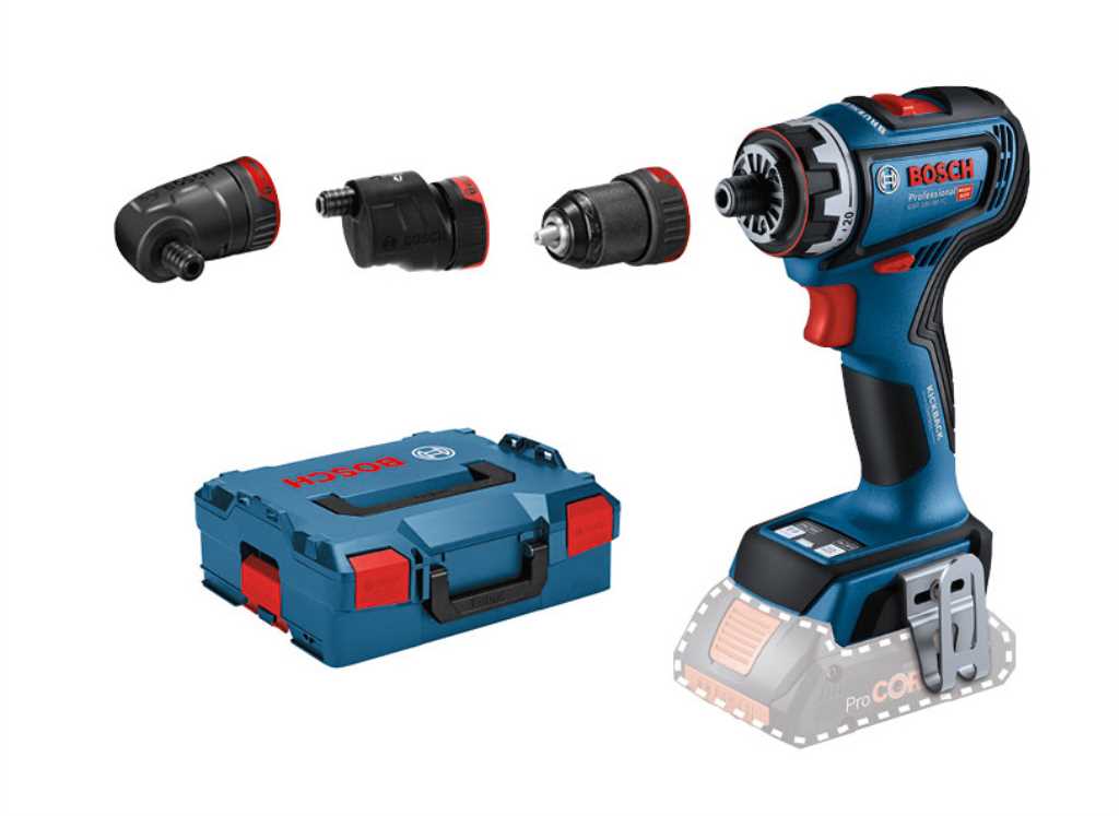 GSR 18V-90 FC Professional: perfekt ausgestattet für professionelle Arbeiten. Das Bosch Professional FlexiClick System ist ein vielseitiges System mit mühelos wechselbaren Aufsätzen. Mit einer Kopflänge von nur 136 mm und einem max. harten Drehmoment von 64 Nm hast du ein äußerst kompaktes und leistungsstarkes Werkzeug zur Hand. Lieferumfang: mit Exzenteraufsatz GFA 18-E; Metallbohrfutteraufsatz für Bohrfutter GFA 18-M und Winkelaufsatz GFA 18-W, in L-Boxx, ohne Akkus und Ladegerät