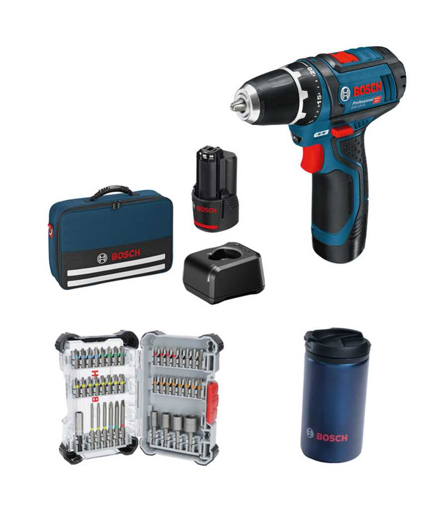 Akku-Bohrschrauber GSR 12V-15. Das handliche Kraftpaket. Mit 169 mm enorm kurze Bauform für optimale Handhabung vor allem bei Bohr- und Schraubanwendungen über Kopf und an engen Stellen. Professionelle Leistung: 2-Gang-Getriebe sorgt für kraftvolle 15 Nm (weicher Schraubfall) beim Bohren (bis 19 mm) und Schrauben (bis 7 mm). Vollwertiges 10-mm-Auto-Lock-Bohrfutter. Bosch Electronic Cell Protection (ECP): Schützt den Akku vor Überlastung, Überhitzung und Tiefentladung. Praktische Batterie-Ladezustandsanzeige mit 3 LEDs. Integriertes LED-Licht zur Beleuchtung des Arbeitsbereichs auch an dunklen Stellen. Motorbremse für präzises Arbeiten bei Serienverschraubungen. Kein Memory-Effekt: Der Akku kann unabhängig vom Ladezustand jederzeit geladen werden, ohne die Zellen zu schädigen. Ladegerät GAL 12V-20 Professional (2 607 226 187), 2 x Akku GBA 12V 2.0 Ah (1 600 Z00 02X).