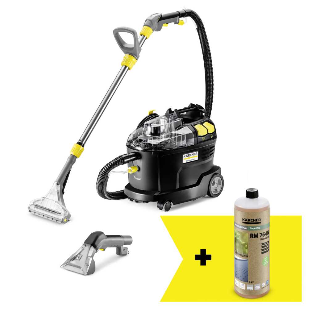 Das limitiert verfügbare schwarze Sprühextraktionsgerät Puzzi 8/1 Go!Further aus 44 Prozent recyceltem Kunststoff¹? ist mit exklusivem Zubehör und einer 1-Liter-Flasche des Reinigungsmittels RM 764N OA ausgestattet. Dank seiner hervorragenden Rücksaugleistung ermöglicht der professionelle Waschsauger sehr gute und hygienische Reinigungsergebnisse sowie eine schnelle Wiederbegehbarkeit von textilen Flächen. Dazu sprüht das Sprühextraktionsgerät die Reinigungslösung tief in die Textilfasern ein, saugt diese anschließend inklusive des gelösten Schmutzes wieder ab und eignet sich so perfekt zur Reinigung von Polstern, Teppichböden und anderen textilen Oberflächen. Seine robuste, kompakte Bauweise sorgt für eine lange Lebensdauer und damit eine hohe Wirtschaftlichkeit – ideal für Gebäudereiniger, im Hotel- und Gaststättengewerbe oder bei der Fahrzeuginnenreinigung. Zur besseren Sicht auf die Schmutzflotte sind der Gerätedeckel sowie die Polster- und die Bodendüse transparent gehalten. Ein Sichtfenster am Griff erhöht die Kontrollmöglichkeiten dabei zusätzlich. Das geringe Gewicht des Puzzi 8/1 Go!Further und ein ergonomischer Tragegriff ermöglichen einen einhändigen Transport. Lieferumfang: gem. Abbildung.